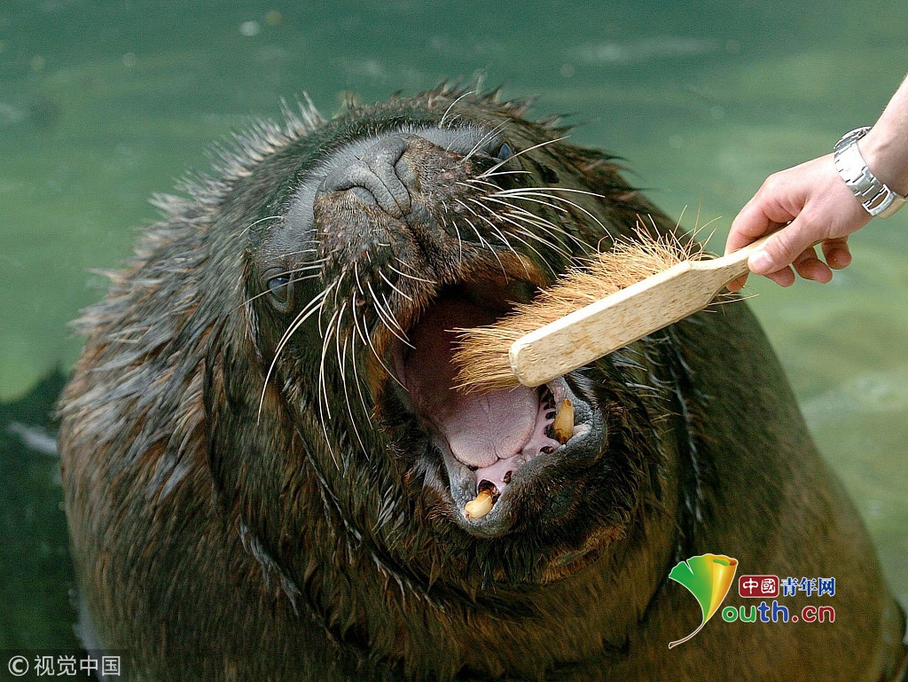 2006年5月18日,英國城市達(dá)德利,一只十四歲的海獅奧利爾在動物園里接受飼養(yǎng)員的護(hù)理。奧利爾體重達(dá)四百千克,每次進(jìn)餐后飼養(yǎng)員要給奧利爾刷牙,每月進(jìn)行一次牙科衛(wèi)生檢查。