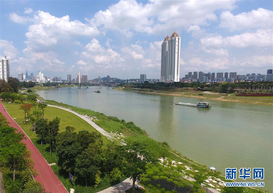 這是船舶在西江黃金水道邕江南寧段航行(5月20日攝,無(wú)人機(jī)航拍)。 新華社記者 周華 攝