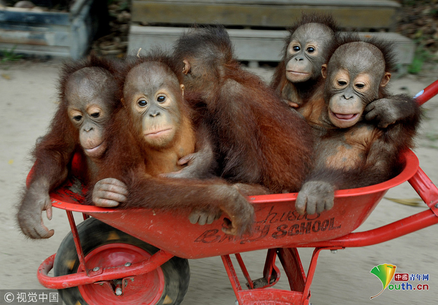 印尼加里曼丹克塔邦,國際動物救援(IAR)猩猩安全與保護(hù)中心里,飼養(yǎng)員用獨(dú)輪車把猩猩寶寶送到森林學(xué)校。圖片作者:Newscom