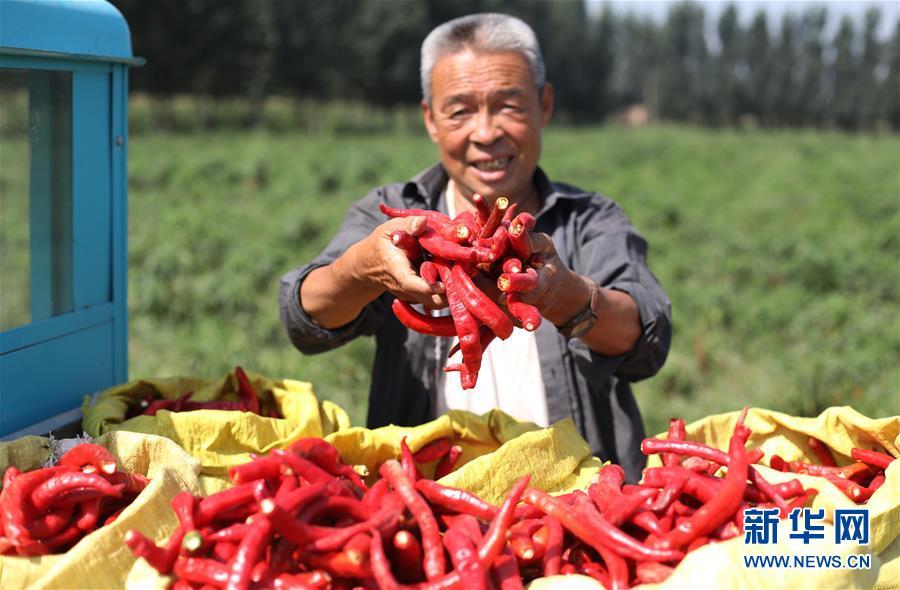 9月16日,阜城縣王集鄉(xiāng)南張莊村農民在展示采摘的辣椒。近年來,河北省阜城縣王集鄉(xiāng)在推進產業(yè)富民過程中,積極引導農民調整農業(yè)產業(yè)結構,按照品種特色化、種植規(guī)?;a銷一體化的“公司+基地+農戶”的經營模式,鼓勵農民發(fā)展特色辣椒種植,推行“訂單種植”模式,開辟出了一條農民創(chuàng)收新路徑。目前,阜城縣王集鄉(xiāng)辣椒種植面積3100余畝,每畝年收益2500元以上,帶動當地農民實現增收。新華社記者朱旭東攝