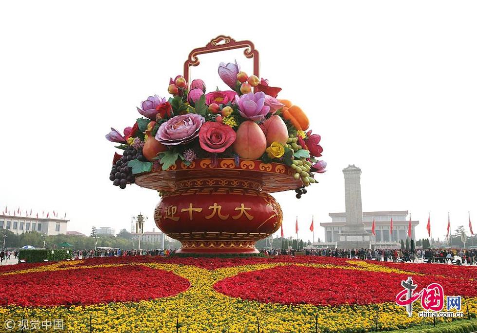 2017年天安門廣場(chǎng)大花籃以喜慶的花果籃為主景,花籃頂高17米,籃體高15.3米,底部直徑達(dá)50米?;@體南側(cè)寫有“祝福祖國(guó)、1949-2017”,北側(cè)寫有“喜迎十九大” 字樣?;ü@內(nèi)共使用主花56朵(牡丹、月季、玉蘭、金桂、迎春花、蘋果花、紫藤花、文心蘭、葉子花),其中最大牡丹直徑3.2米,果實(shí)6種(石榴、桃、柿子、蘋果、海棠、葡萄)。寓意吉祥的果實(shí)和花卉,象征十八大以來,黨和國(guó)家在各個(gè)領(lǐng)域取得的輝煌成就,碩果累累。底部花壇采用心形圖案,寓意紅心向黨,象征著全國(guó)人民緊密團(tuán)結(jié)在以習(xí)近平同志為核心的黨中央周圍,表達(dá)對(duì)祖國(guó)繁榮富強(qiáng)、欣欣向榮的美好祝福。