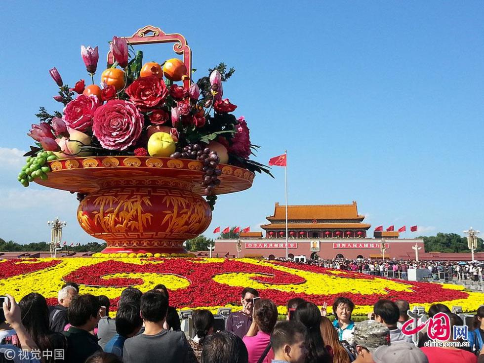 2013年天安門(mén)廣場(chǎng)首次以花果籃的形式布置國(guó)慶主花壇,國(guó)慶花籃名為“祝福祖國(guó)”,高達(dá)18.2米,籃盤(pán)直徑達(dá)到15米,中心花壇直徑達(dá)到50米,是天安門(mén)廣場(chǎng)歷年最大的花籃。本次的花果籃使用牡丹、玉蘭、松枝、竹子四個(gè)品種的大型仿真花,并創(chuàng)新融合石榴、蘋(píng)果、蟠桃、葡萄等水果造型,表達(dá)了富貴吉祥、平安幸福、節(jié)節(jié)高升等良好寓意。除了仿真的花果,施工方還在花果籃中穿插擺放大規(guī)格三角梅、一品紅等盆栽花卉。據(jù)了解,本次花果籃內(nèi)的三角梅是首次進(jìn)入天安門(mén)國(guó)慶花壇主景。此外,“籃子”采用玻璃鋼材料,可以重復(fù)利用。 據(jù)了解,如此巨大的花果籃可抵抗10級(jí)大風(fēng)。