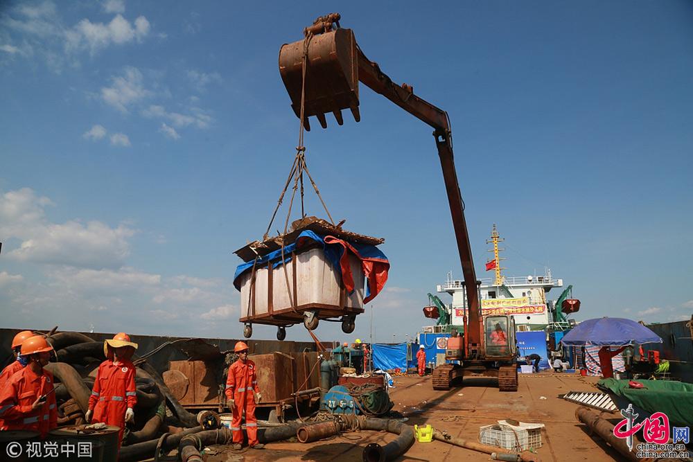 2018年9月25日,遼寧大連,考古工作人員把出水的經(jīng)遠(yuǎn)艦遺物進(jìn)行轉(zhuǎn)運(yùn)。視覺中國