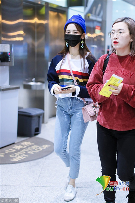 2018年9月25日,北京,“錦鯉少女”楊超越現(xiàn)身機場,她身穿“彩虹裝”青春無敵,戴著糖果色耳環(huán),細(xì)節(jié)處可愛吸睛。