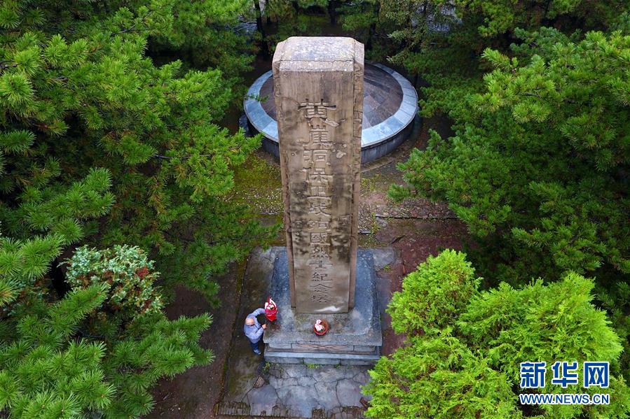 在黃崖洞烈士陵園,趙乃堂將花擺在黃崖洞保衛(wèi)戰(zhàn)殉國烈士紀(jì)念塔前(9月19日無人機(jī)拍攝)。 新華社記者 詹彥 攝