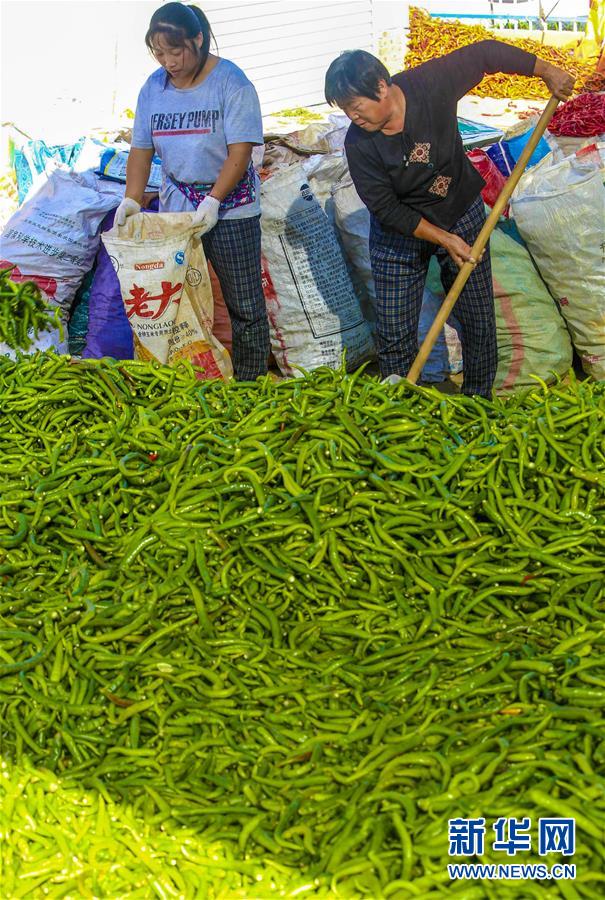 9月28日,饒陽縣留楚鄉(xiāng)影林村的種植戶在將辣椒裝袋。 近年來,河北省饒陽縣結合市場需求,積極引進特色品種辣椒種植,開辟出一條農(nóng)民增收致富新路。目前,該縣特色辣椒種植面積1000余畝,種植戶年均增收3000余元。 新華社記者 李曉果攝