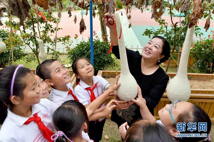 9月29日,在威海市經(jīng)濟技術(shù)開發(fā)區(qū)新都小學,老師帶著學生采摘葫蘆。