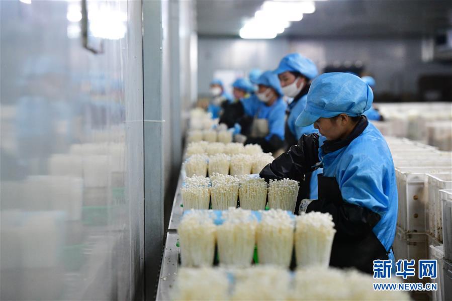 在位于清豐縣的河南龍豐實業(yè)股份有限公司,工人在包裝車間流水線上采摘、分揀金針菇(9月28日攝)。新華社記者馮大鵬攝