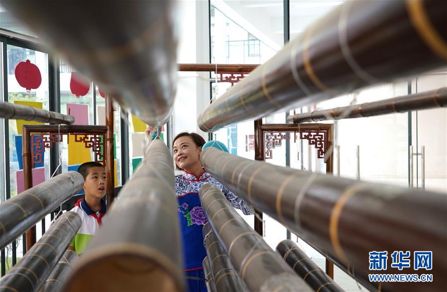 10月8日,崇義縣竹樂樂團(tuán)的演員在教學(xué)生演奏竹板琴。 近年來,江西省崇義縣思源實(shí)驗(yàn)學(xué)校定期開設(shè)竹樂課,邀請(qǐng)崇義縣竹樂樂團(tuán)的演員教授學(xué)生演奏竹排琴、竹板琴等竹樂樂器,激發(fā)學(xué)生了解傳統(tǒng)文化的熱情。 新華社記者胡晨歡攝