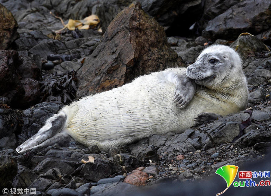 一只大西洋海豹幼崽躺在海邊礁石上。