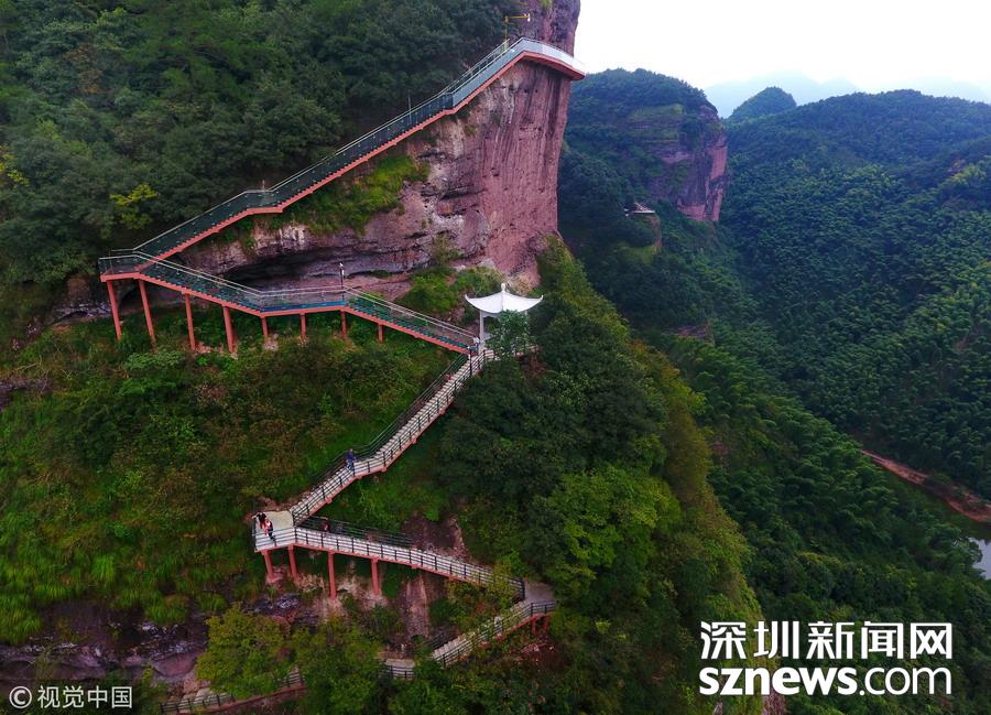 深圳新聞網(wǎng)訊 2018年6月19日,航拍江西贛州南武當(dāng)山百米高空玻璃棧道。棧道緊貼峭壁,在懸崖之上凌空蜿蜒穿行,猶如一條玉龍盤旋在綠林石海之中。 南武當(dāng)山位于江西最南端的龍南縣武當(dāng)鎮(zhèn)境內(nèi),景區(qū)核心面積達(dá)到13.5平方公里,擁有99座千姿百態(tài)的巍峨石峰,丹霞地質(zhì)風(fēng)貌突出,連綿十里,被稱為“武當(dāng)十里畫廊”。