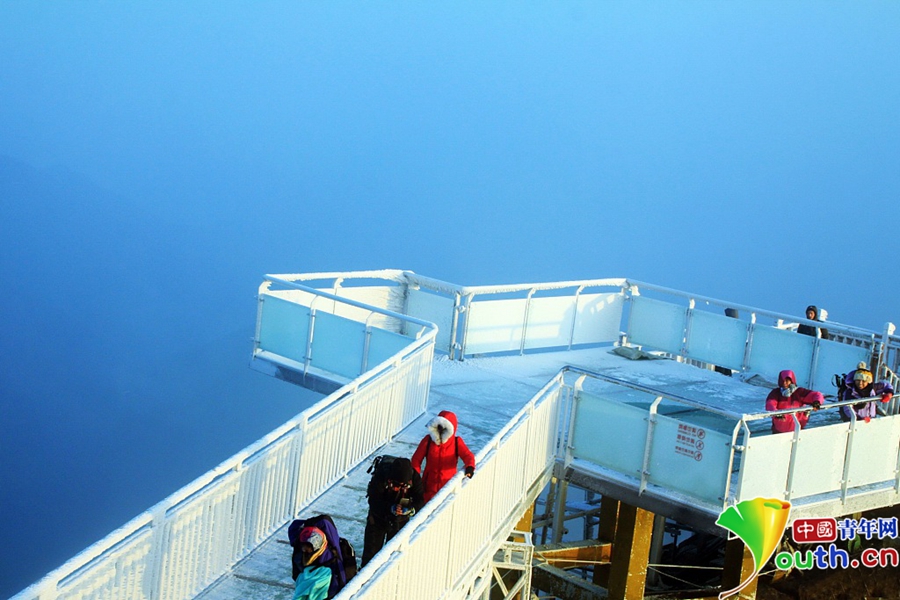 上到金子山最高峰可以看到,玻璃天梯像一條巨龍,沿著金子山最高峰山腰蜿蜒而上,每一個階梯都是玻璃做的,頂上是藍(lán)天白云,四周是莽莽群山,天梯下面是深不可測的懸崖絕壁。