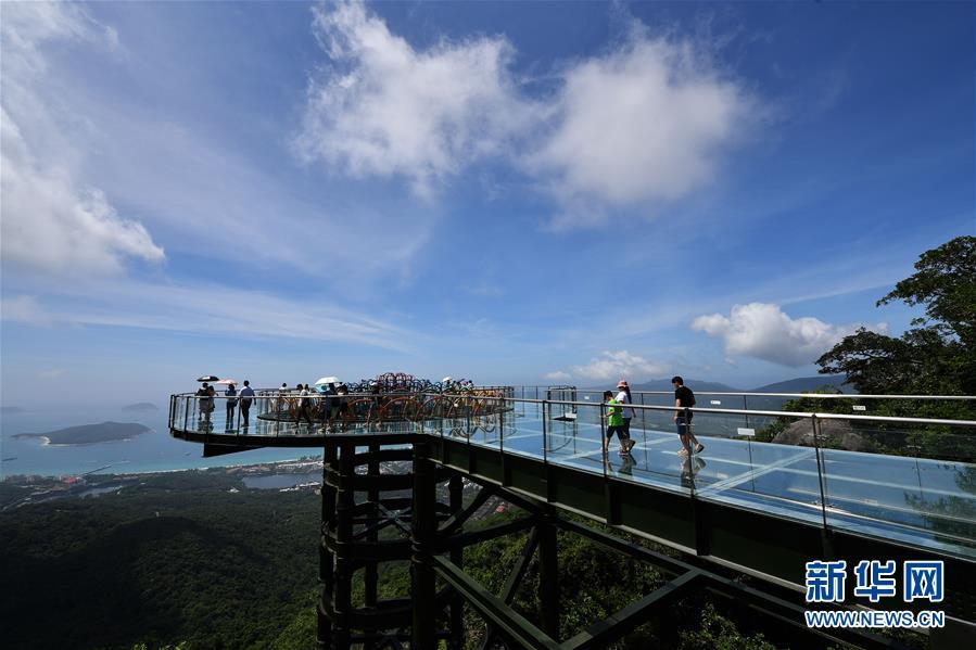 8月31日,游客在玻璃觀景平臺上參觀游覽。近日,位于海南省三亞市亞龍灣熱帶天堂森林公園的大佛石全海景玻璃棧道開始正式營業(yè)。凌空而建的玻璃棧道全長400米,游客可將亞龍灣的美景盡收眼底。新華社記者郭程攝