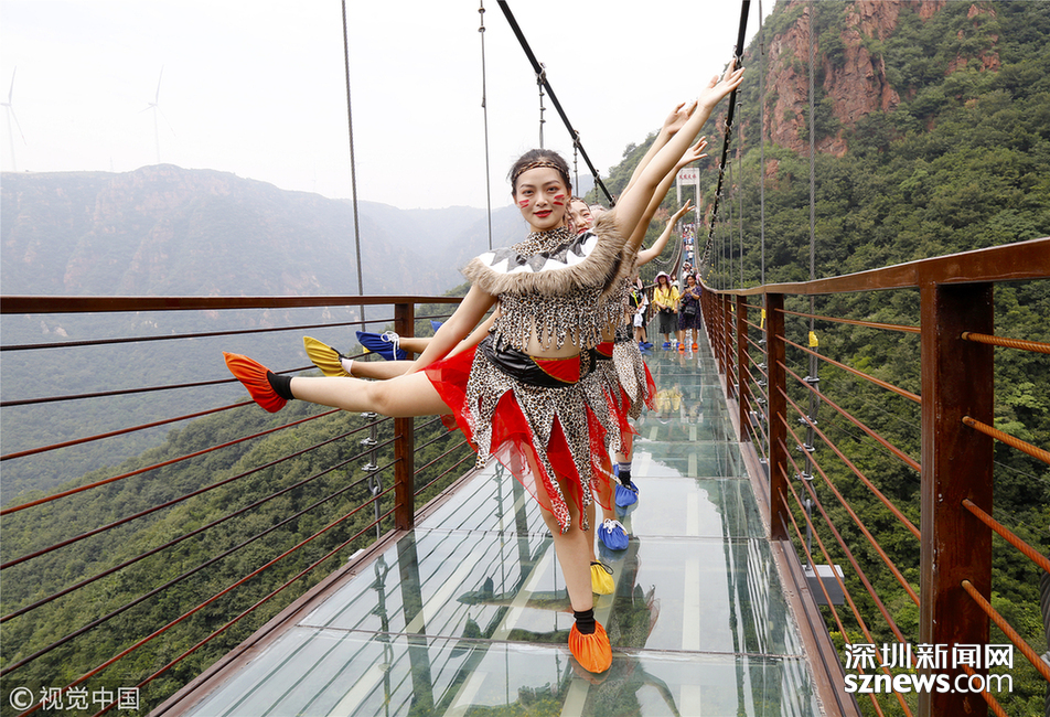 2018年6月30日,鄭州新密一景區(qū)的玻璃吊橋上,幾名美女大學(xué)生身穿“野人”服裝練習(xí)瑜伽,吸引了眾多游客的圍觀。據(jù)了解,這些大學(xué)生來自鄭州。