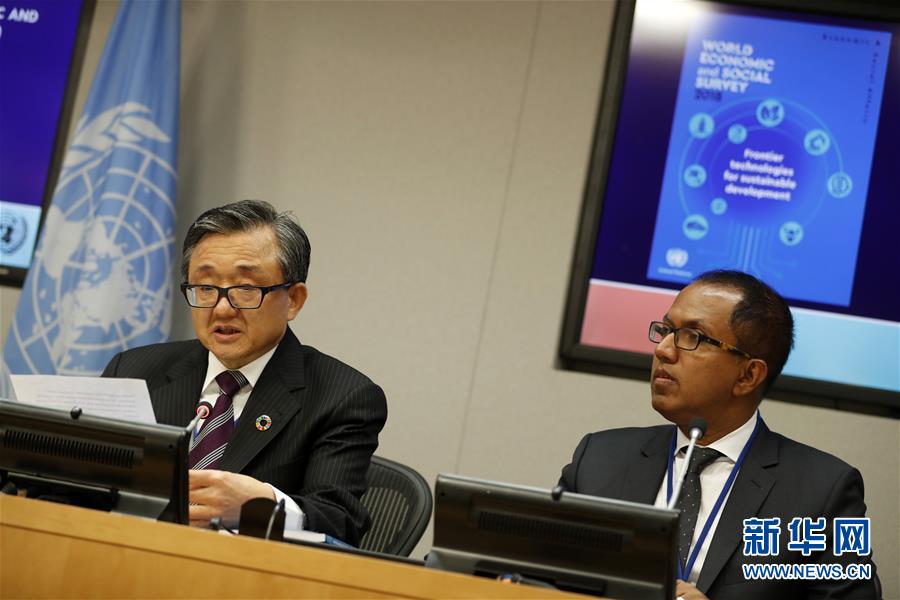 10月8日,在位于紐約的聯(lián)合國總部,聯(lián)合國負責經(jīng)濟和社會事務的副秘書長劉振民(左)向記者介紹《2018年世界經(jīng)濟和社會概覽》。新華社記者李木子攝