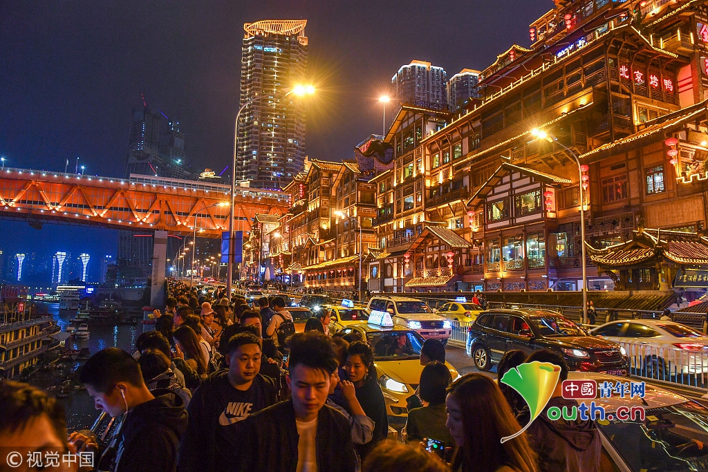 2018年10月8日,重慶,國慶長假結(jié)束后,山城網(wǎng)紅景點(diǎn)洪崖洞依然處于暴擠狀態(tài),在抖音等短視頻平臺走紅以后,絢爛輝煌的洪崖洞夜景成為赴渝旅行第一打卡景點(diǎn)。