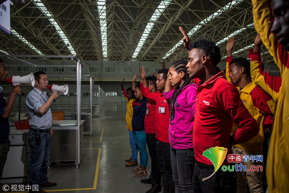 7月31日,埃塞俄比亞首都亞的斯亞貝巴的一家中國民營制鞋工廠——華堅(jiān)鞋廠,下午的工作開始前,當(dāng)?shù)毓蛦T用中文喊著“一二三四”列隊(duì)集合,合唱廠歌。