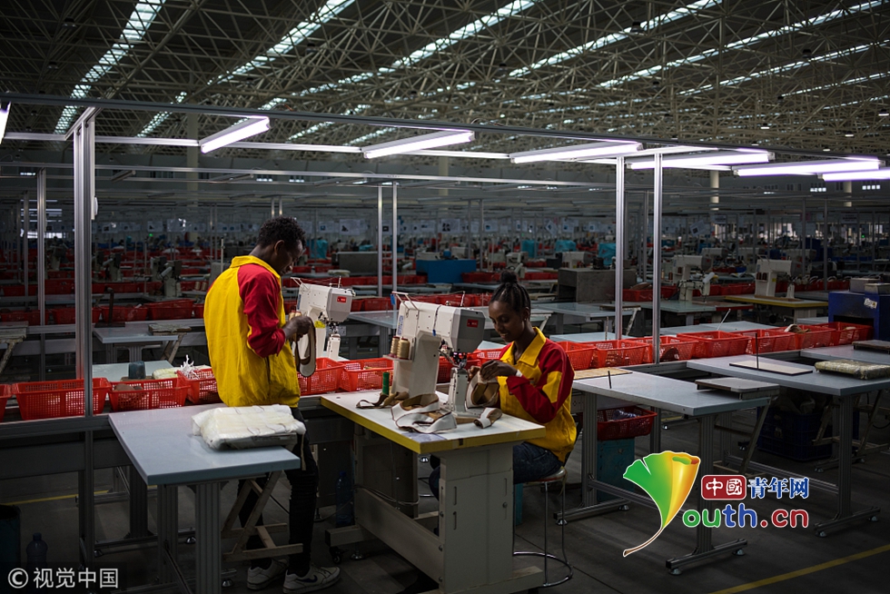 當(dāng)?shù)貢r(shí)間2018年8月1日,埃塞俄比亞。埃塞俄比亞首都亞的斯亞貝巴南部郊外,有一座東方工業(yè)園,這是中國在埃塞俄比亞的首個(gè)國家級境外經(jīng)貿(mào)合作區(qū)。園區(qū)占地5平方公里,連接著兩個(gè)60萬人口的城鎮(zhèn),目前已經(jīng)有85家企業(yè)入駐,行業(yè)涉及紡織、服裝、制鞋、鋼筋、水泥、制藥、汽車組裝等,這些企業(yè)絕大部分來自中國。圖為鞋廠工人在2015年啟用的新廠區(qū)內(nèi)工作。