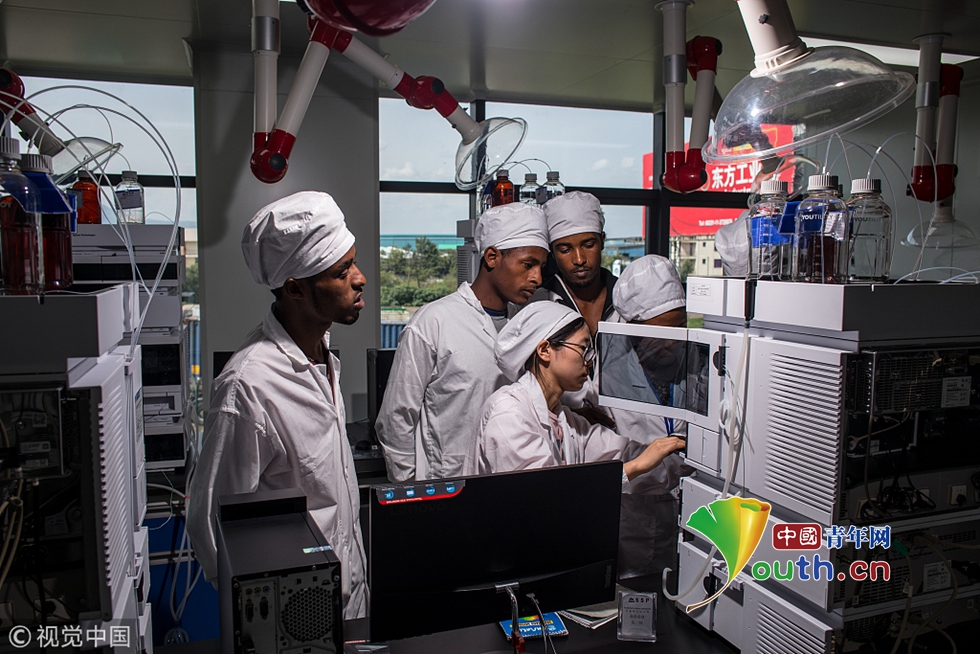 7月30日,埃塞俄比亞,首都亞的斯亞貝巴的東方工業(yè)園內(nèi)一家中國制藥廠,27歲的中國員工汪紅梅為當(dāng)?shù)毓蛦T講解液相色譜器械使用要領(lǐng)。整個(gè)實(shí)驗(yàn)室共有4名中方員工和18名當(dāng)?shù)毓蛦T。