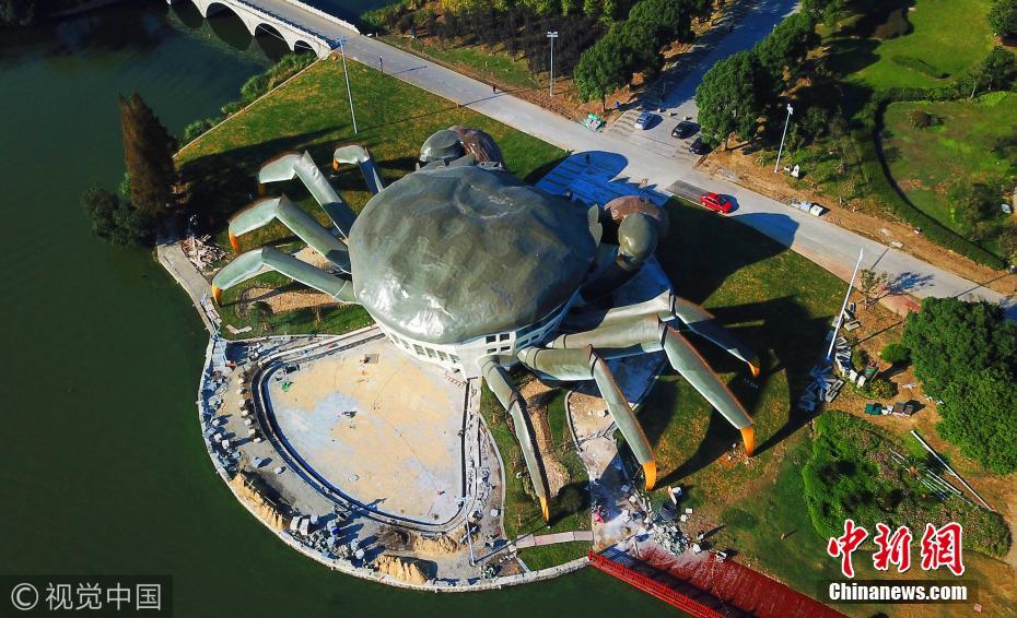 2017年10月31日,江蘇省昆山市巴城巴解園內(nèi)的東陽(yáng)澄湖岸邊,一只青背白肚金爪黃毛,長(zhǎng)75米,高約16米的蘇州陽(yáng)澄湖“超級(jí)大閘蟹”栩栩如生。圖片來(lái)源:視覺(jué)中國(guó)