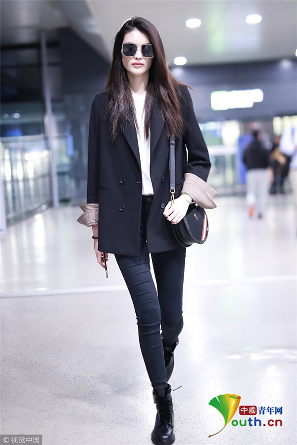2018年10月15日,上海,何穗亮相機(jī)場。她身穿深色西裝搭配黑色緊身褲大秀超模身材,簡約造型依舊高級感十足,輕撩秀發(fā)散發(fā)女人味。