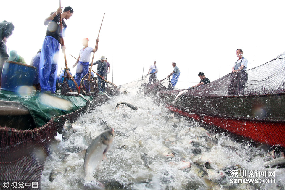 2018年6月26日,江蘇省常州市嘉澤鎮(zhèn)捕撈村的漁民組織夏季捕撈,一網(wǎng)魚達(dá)五萬余斤,以鰱魚為主,供應(yīng)市場需求。夏捕的魚價(jià)較平時(shí)有所上漲,漁民粗略估計(jì)可增收上萬余元。