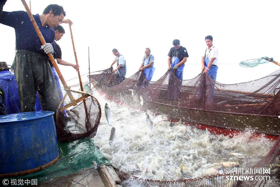 2018年6月26日,江蘇省常州市嘉澤鎮(zhèn)捕撈村的漁民組織夏季捕撈,一網(wǎng)魚達(dá)五萬余斤,以鰱魚為主,供應(yīng)市場需求。夏捕的魚價(jià)較平時(shí)有所上漲,漁民粗略估計(jì)可增收上萬余元。