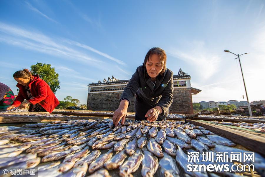 鄱陽(yáng)湖畔漁民趁秋光晾魚蝦