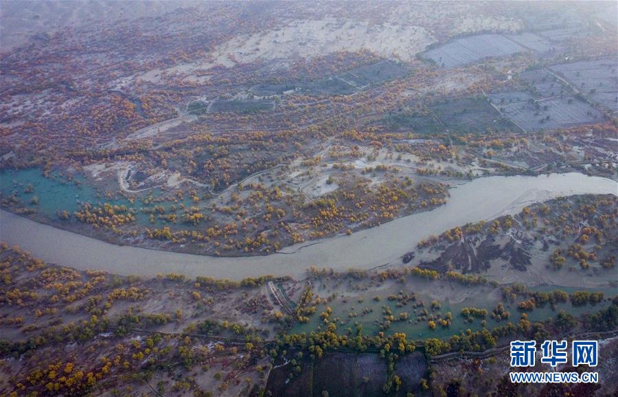 這是10月16日拍攝的從空中俯瞰新疆尉犁縣的胡楊(無人機(jī)拍攝)。 新華社記者 趙戈 攝