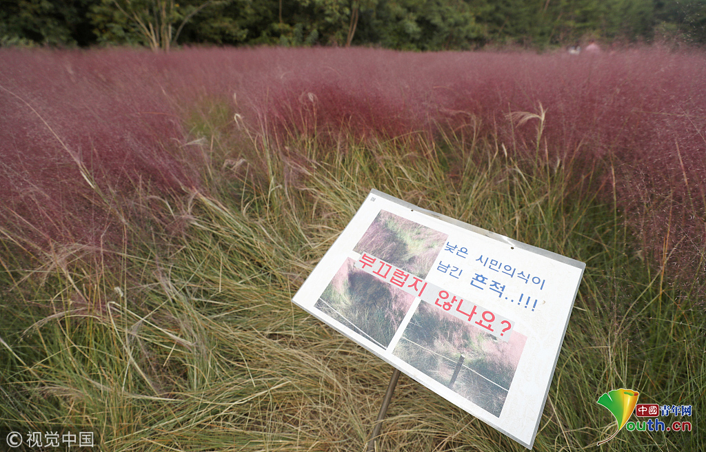 當(dāng)?shù)貢r(shí)間2018年10月16日,韓國(guó)蔚山,近日,蔚山公園大片粉黛亂子草盛開(kāi),粉紅花海浪漫十足,但部分花海遭游客隨意踩踏。圖片作者:Yonhap News Agency