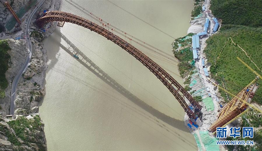 9月28日拍攝的川藏鐵路拉林段重點(diǎn)標(biāo)志性工程藏木特大橋。 當(dāng)日,隨著最后一節(jié)鋼管拱的對(duì)位和鎖定完畢,川藏鐵路拉林段藏木特大橋成功合龍,標(biāo)志著大橋主體結(jié)構(gòu)施工取得了關(guān)鍵性勝利。藏木特大橋由中國中鐵廣州局集團(tuán)承建,拱高112米,橋橫跨雅魯藏布江峽谷,水深66米。 新華社記者普布扎西攝