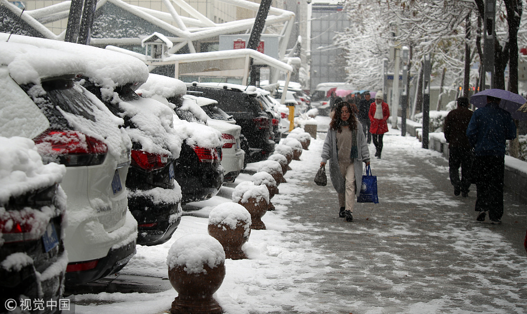 10月18日,行人穿行在烏魯木齊積雪覆蓋的人行道上。當(dāng)日,新疆烏魯木齊迎來一場降雪。 新華社記者 江文耀 攝