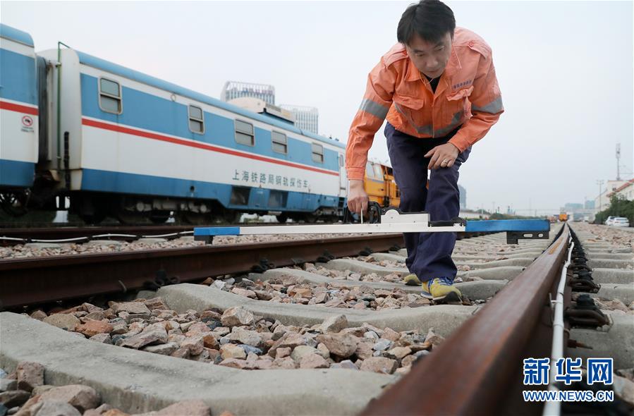 10月17日,李峰在上海何家灣站內(nèi)鐵軌上演示早期使用鋁合金道尺檢測鋼軌間距的操作。這一操作全憑檢修工人經(jīng)驗(yàn),近四公里的線路檢查,需要工人彎腰上千次。 新華社記者 方喆 攝