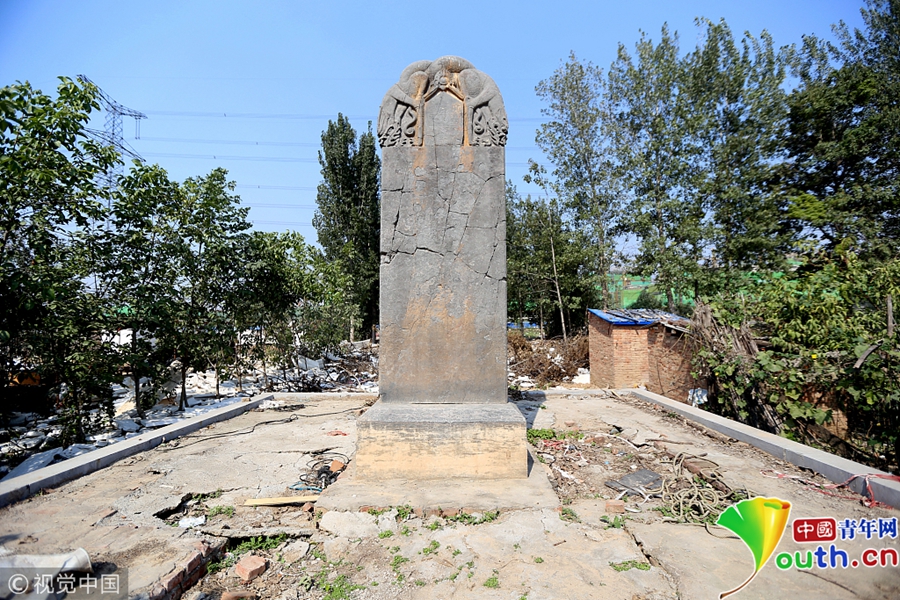 中國青年網(wǎng)北京10月21日電 近日,鄭州市惠濟區(qū)古滎鎮(zhèn)嶺軍峪村已經(jīng)因為城市的發(fā)展被拆遷了,村民們住在安置房里等待著新房的建成,而在嶺軍峪村南約150米的田地里,有一塊在2009年文物普查時被發(fā)現(xiàn)的唐代石碑,在鄭州市發(fā)現(xiàn)唐代的碑刻是比較罕見的。 圖片來源:視覺中國