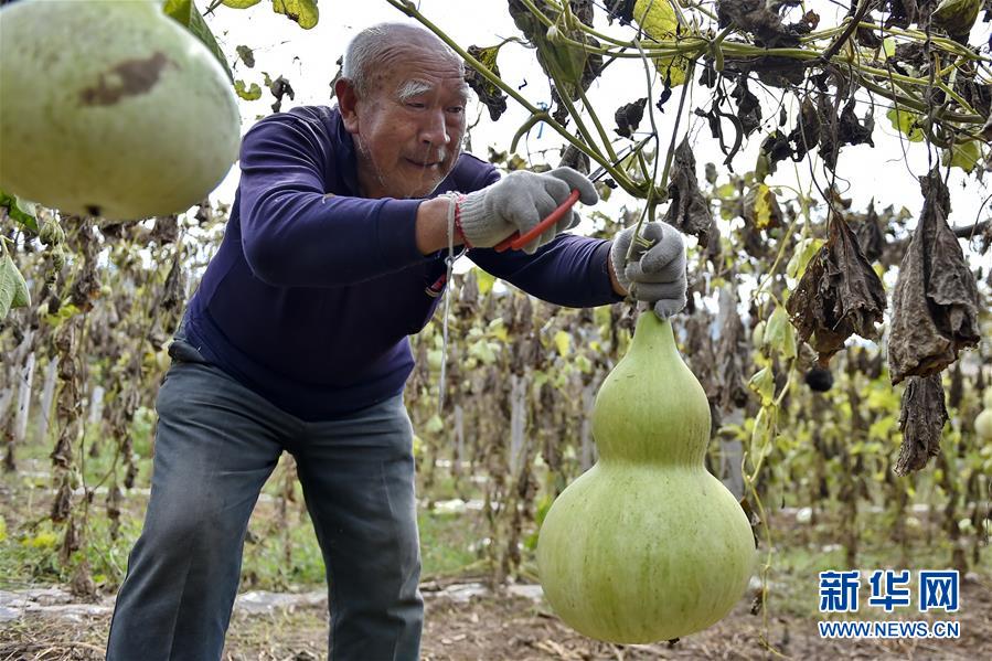 9月27日,山西省安澤縣和川鎮(zhèn)孔旺村的村民在摘葫蘆。近日,山西省安澤縣和川鎮(zhèn)孔旺村種植的葫蘆喜獲豐收,村民們忙著將摘下的葫蘆去皮晾干??淄逵?016年成立葫蘆種植合作社,種植、采摘、加工等環(huán)節(jié)全部由貧困戶負責,為貧困戶拓寬增收渠道。新華社記者 曹陽 攝