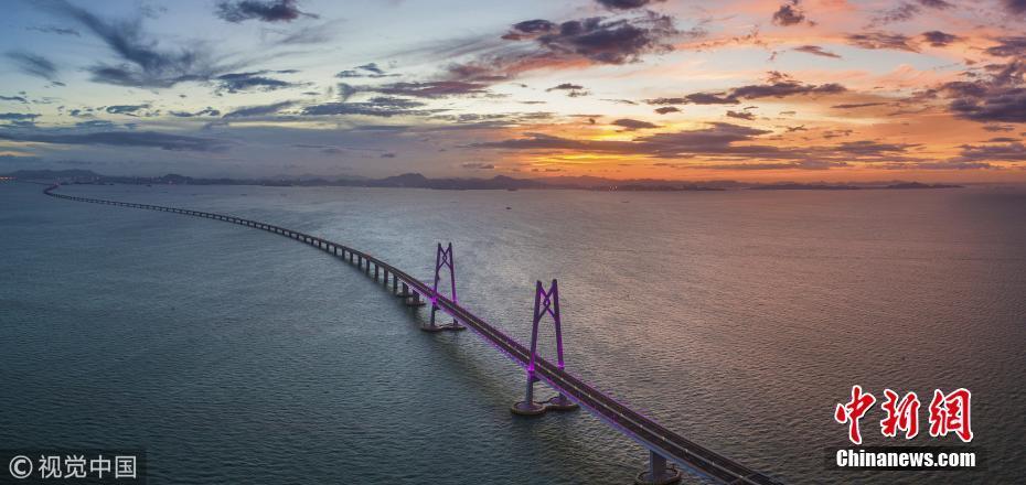 2018年7月18日,珠海,滿天紅霞,亮燈后的港珠澳大橋跨立在伶仃洋上,進(jìn)入通車前的最后準(zhǔn)備。張由瓊 攝 圖片來(lái)源:視覺(jué)中國(guó)
