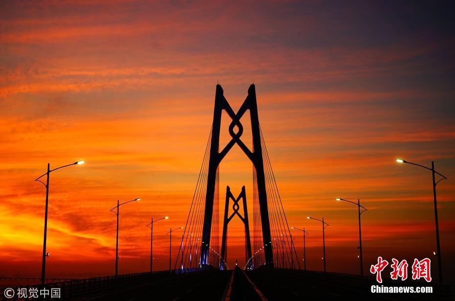 2018年1月15日,廣東珠海,記者再上港珠澳大橋。夕陽西下,港珠澳大橋在晚霞的映照下顯得格外壯麗秀美。于燕敏 攝 圖片來源:視覺中國