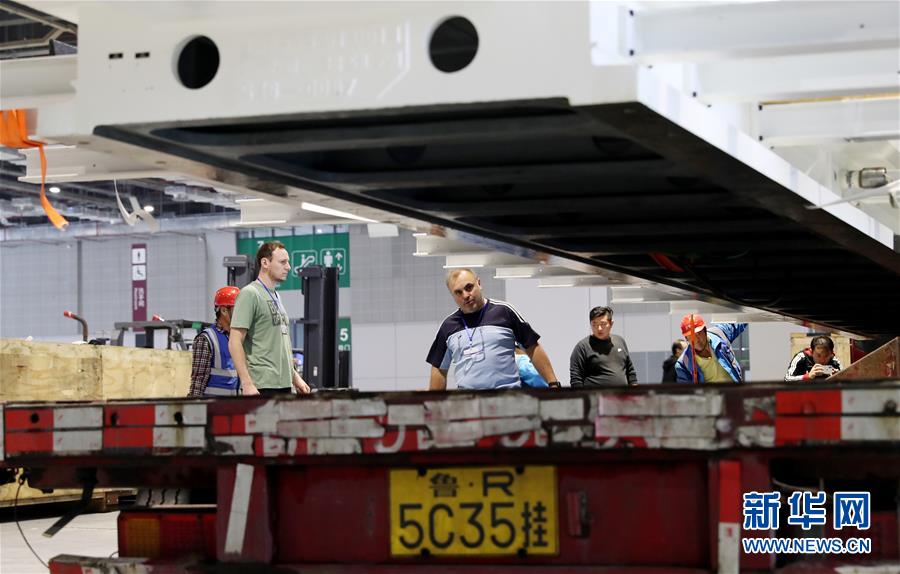 10月22日,德國工程師馬丁·霍爾茨海德(中)在吊裝過程中查看“金牛座”龍門銑床床身位置。 當日,來自德國的首屆進口博覽會最大展品——“金牛座”龍門銑床完成初步組裝,將運往國家會展中心(上海)3號館進行最后的安裝施工。這是德國瓦德里希科堡公司研發(fā)的機床設(shè)備,高約8米,占地面積約200平方米,將在智能及高端裝備區(qū)進行展出。 新華社記者方喆攝