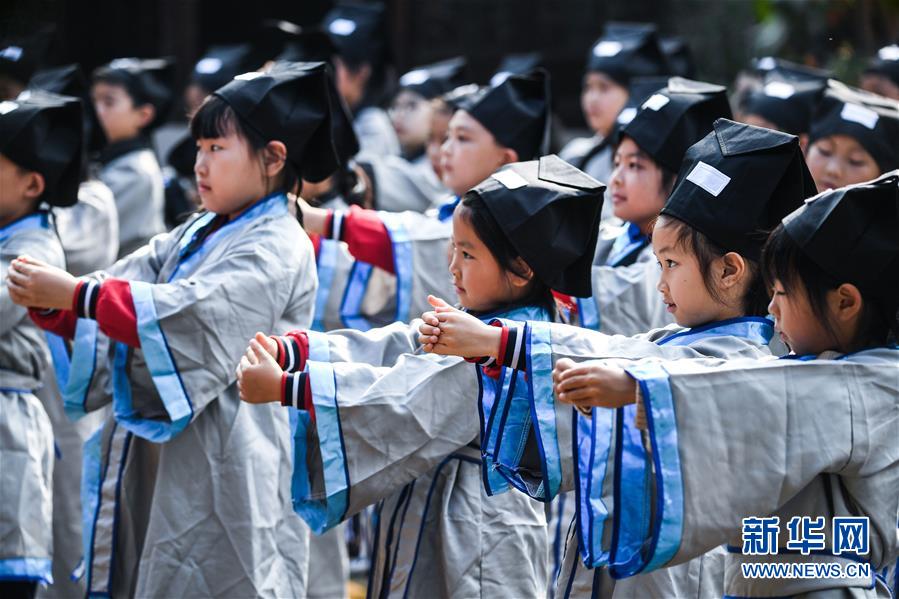 10月23日,學生們在老師的帶領下學習敬拜禮儀。當日,浙江省長興縣第八小學舉行“誦家規(guī)家訓,傳中華美德”校園“誠敬日”主題教育活動,通過誦讀國學經(jīng)典、講勵志故事、演美德戲劇等形式,讓學生感受優(yōu)秀傳統(tǒng)文化。近年來,該學校立足“誠敬”文化,注重國學啟蒙教育,讓學生從小培養(yǎng)“以誠立身、以敬處事”的良好品質。新華社記者 徐昱 攝