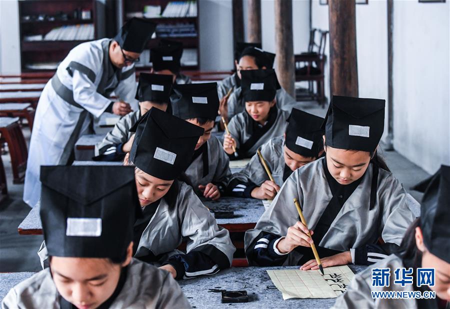 10月23日,學生們在參加“誠敬日”傳統(tǒng)書法學習。當日,浙江省長興縣第八小學舉行“誦家規(guī)家訓,傳中華美德”校園“誠敬日”主題教育活動,通過誦讀國學經(jīng)典、講勵志故事、演美德戲劇等形式,讓學生感受優(yōu)秀傳統(tǒng)文化。近年來,該學校立足“誠敬”文化,注重國學啟蒙教育,讓學生從小培養(yǎng)“以誠立身、以敬處事”的良好品質。新華社記者 徐昱 攝