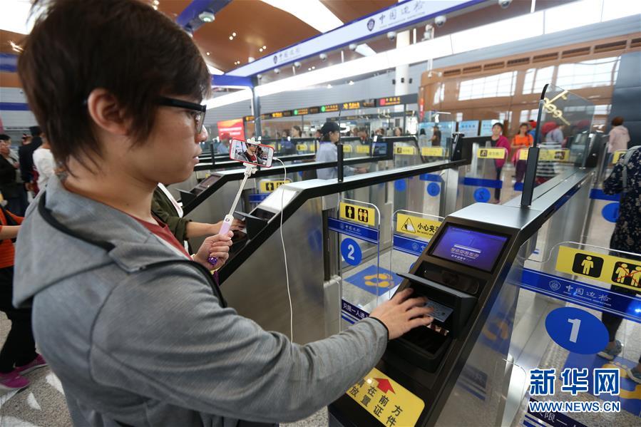 10月24日,一名男子手持自拍桿在自助通道過關(guān)。 當日,港珠澳大橋正式通車。
