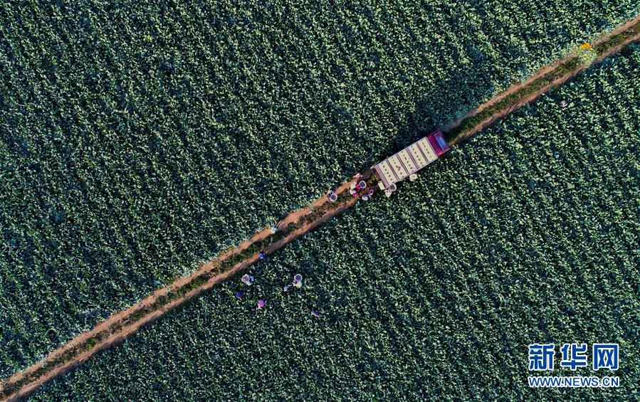 10月29日,樂亭縣馬頭營(yíng)鎮(zhèn)馬頭營(yíng)村的農(nóng)民在收獲菜花(無人機(jī)拍攝)。 新華社記者楊世堯攝