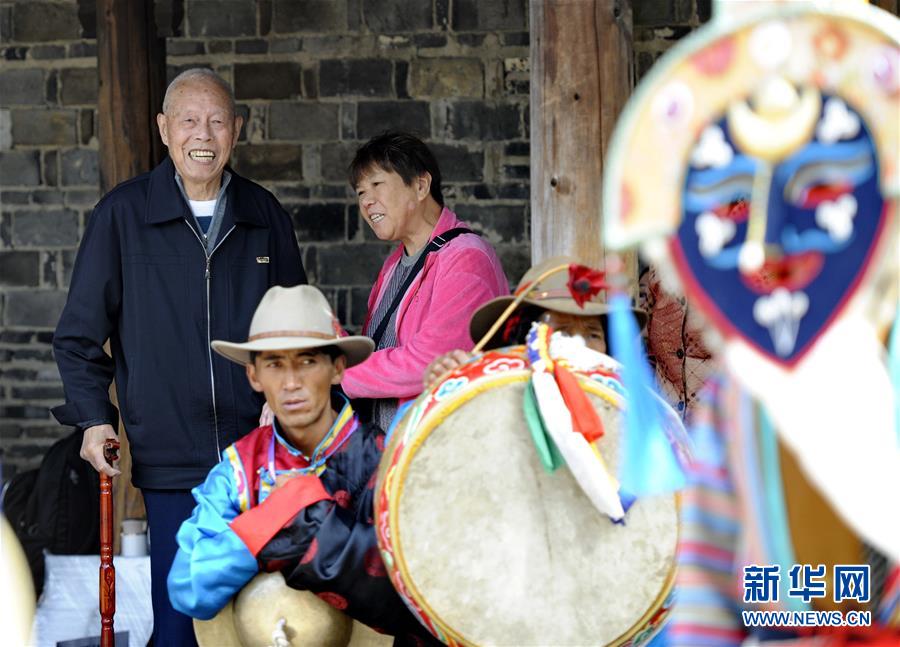 在浙江烏鎮(zhèn)西柵景區(qū)的安渡坊碼頭廣場(chǎng)的涼亭下,來(lái)自無(wú)錫的90歲鄧氏老人(左一)觀看藏戲表演(10月26日攝)。新華社記者 張汝鋒 攝