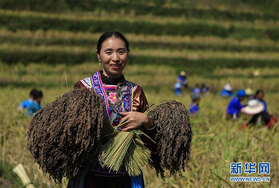 10月30日,在廣西融水苗族自治縣安太鄉(xiāng)元寶村,合作社負責(zé)人謝秀萍在展示剛剛收獲的香糯。 新華社記者 吳建路 攝