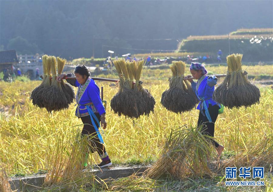 10月30日,在廣西融水苗族自治縣安太鄉(xiāng)元寶村,村民挑著香糯走在田間。 新華社記者 黃孝邦 攝
