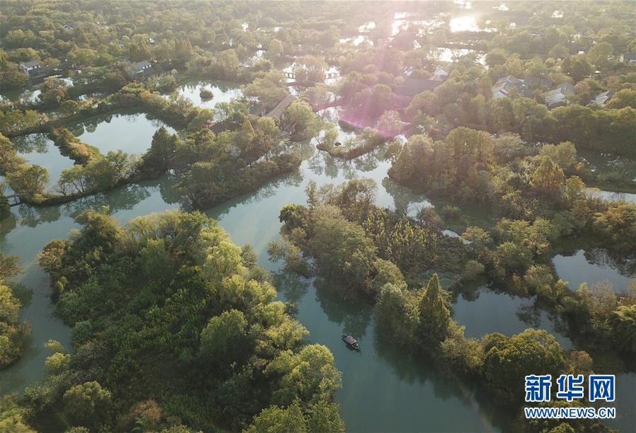10月29日,游船行駛在西溪濕地河道上(無人機(jī)拍攝)。新華社記者翁忻旸攝