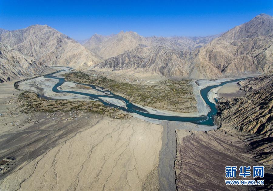 這是位于昆侖山深處的克孜勒蘇柯爾克孜自治州阿克陶縣庫斯拉甫鄉(xiāng),葉爾羌河從村莊流過(10月27日無人機拍攝)。 新華社記者 關俏俏 攝