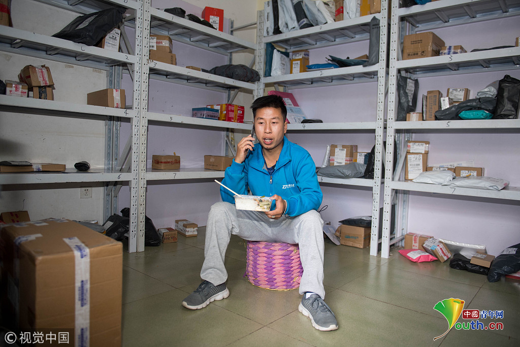 2018年10月16日,云南省昆明市,攝影師實(shí)拍90后快遞員熊忠桃的一天工作。作為一名快遞員,他25歲就買了房,9月份收入3萬(wàn)多。圖片作者:銳圖