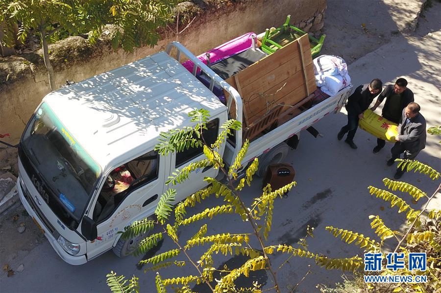 在隴南市武都區(qū)坪埡藏族鄉(xiāng)舊墩村,村民將物品裝車準(zhǔn)備搬遷下山(10月31日無人機拍攝)。 新華社記者 范培珅攝