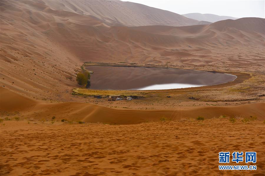 陰雨中的沙漠湖泊,常常讓人以為是一面鏡子(10月18日攝)。 巴丹吉林沙漠位于內(nèi)蒙古西部阿拉善盟,是中國(guó)第三大沙漠,沙丘起伏的曲線陡變成高聳的沙山,碧藍(lán)的湖泊散落在沙海間。 新華社記者 李仁虎 攝